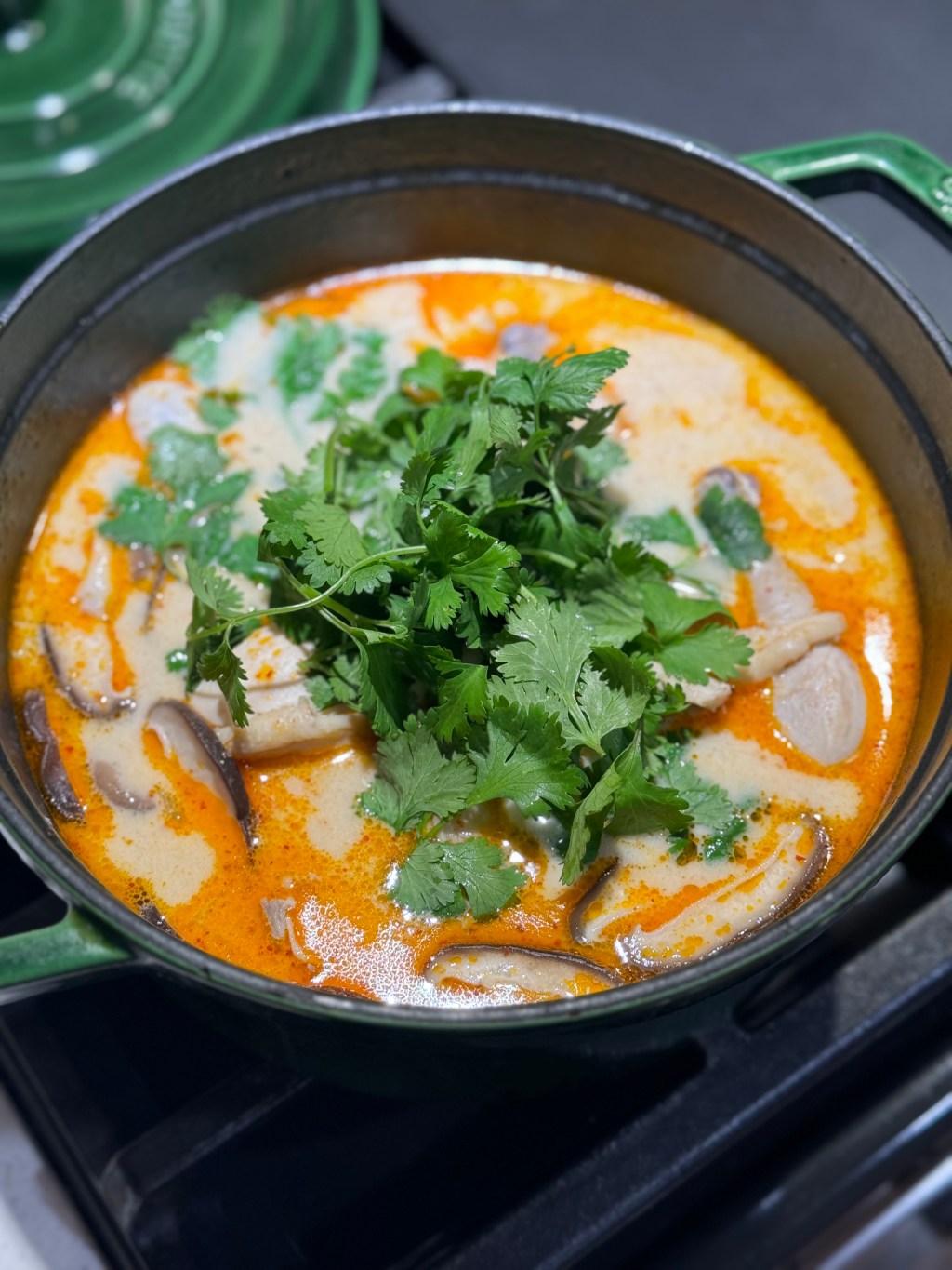 Tom Kha Gai is a Thai soup that’s coconut-milk based with chicken. “Gai” means chicken in Thai. “Tom” means soup. The soup is comprised of various Thai aromatics such as galangal, kaffir lime leaves, lime, lemongrass, and red Thai chilies. It’s a lovely soup to eat when the weather is colder and depending on how many chili peppers you add, can temporarily cure you of your sinuses!