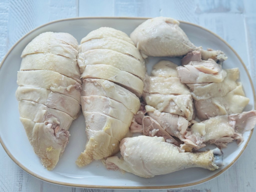 This is a lazy girl Hainanese inspired chicken dish. I make this on days where I want to make something that will yield leftovers and where there is minimal clean up since this all happens in one pot.